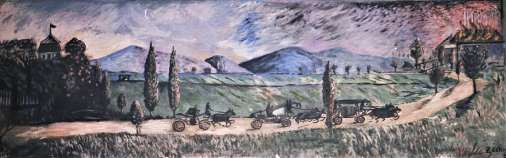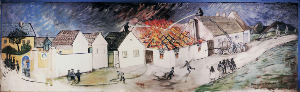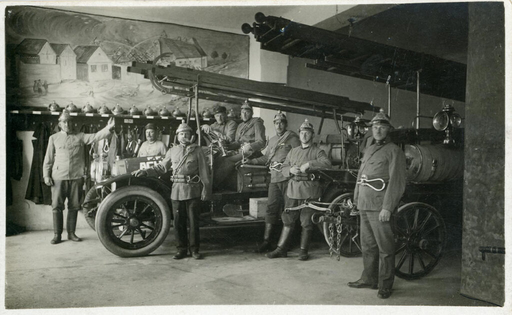 Bild 5: Stolz wird im 1907 errichteten Feuerwehrhaus die Ausrüstung präsentiert. An den Wänden über der Garderobe gab es zwei ca. 2 x 4 Meter große Wandbilder von historischen Einsätzen.