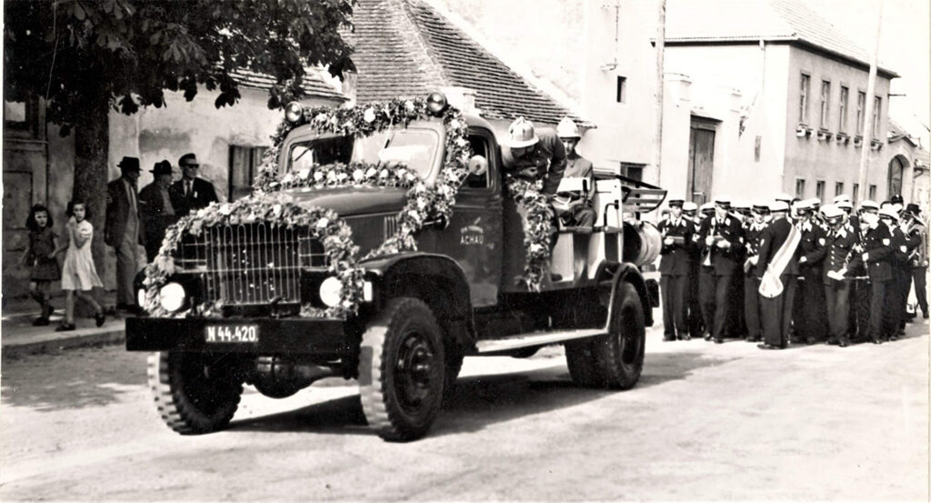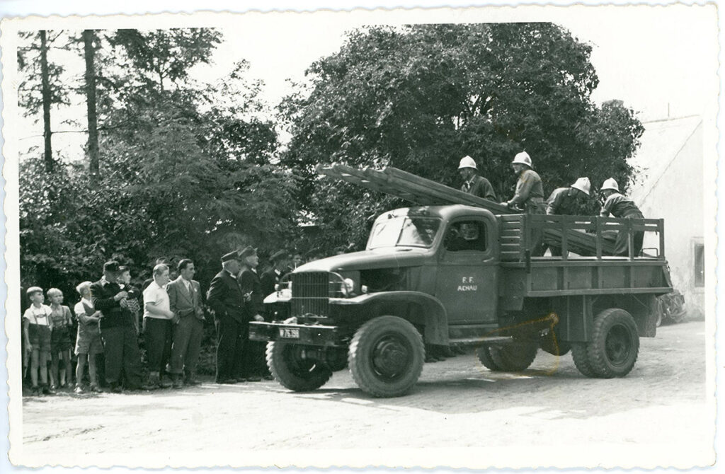 Bild 8 und Bild 9: 1950 wird ein amerikanischer ‚Chevrolet – G7107’ Militärlastwagen angekauft und zu einem Löschfahrzeug umgebaut.